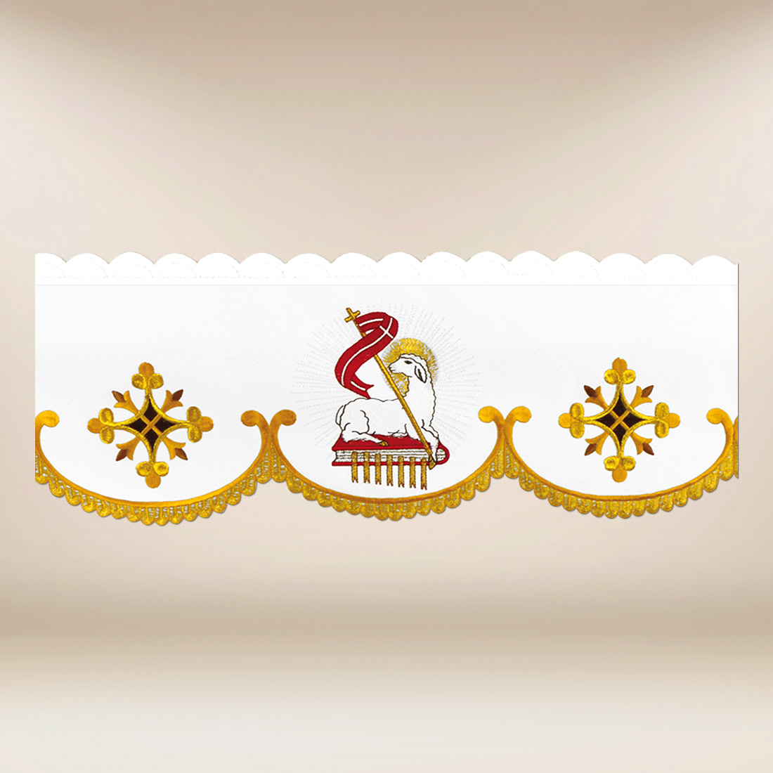 Haft ma wysokość 19 cm, dzięki czemu jest dobrze widoczny również z dalszej perspektywy, zachowując jednocześnie subtelną elegancję. Wzór opracowano w taki sposób, aby pięknie komponował się z ołtarzem oraz pozostałymi elementami kompletu “Agnus Dei”. Dzięki temu możliwe jest stworzenie spójnego wystroju liturgicznego, szczególnie podczas okresu wielkanocnego, adoracji i uroczystych Mszy świętych.