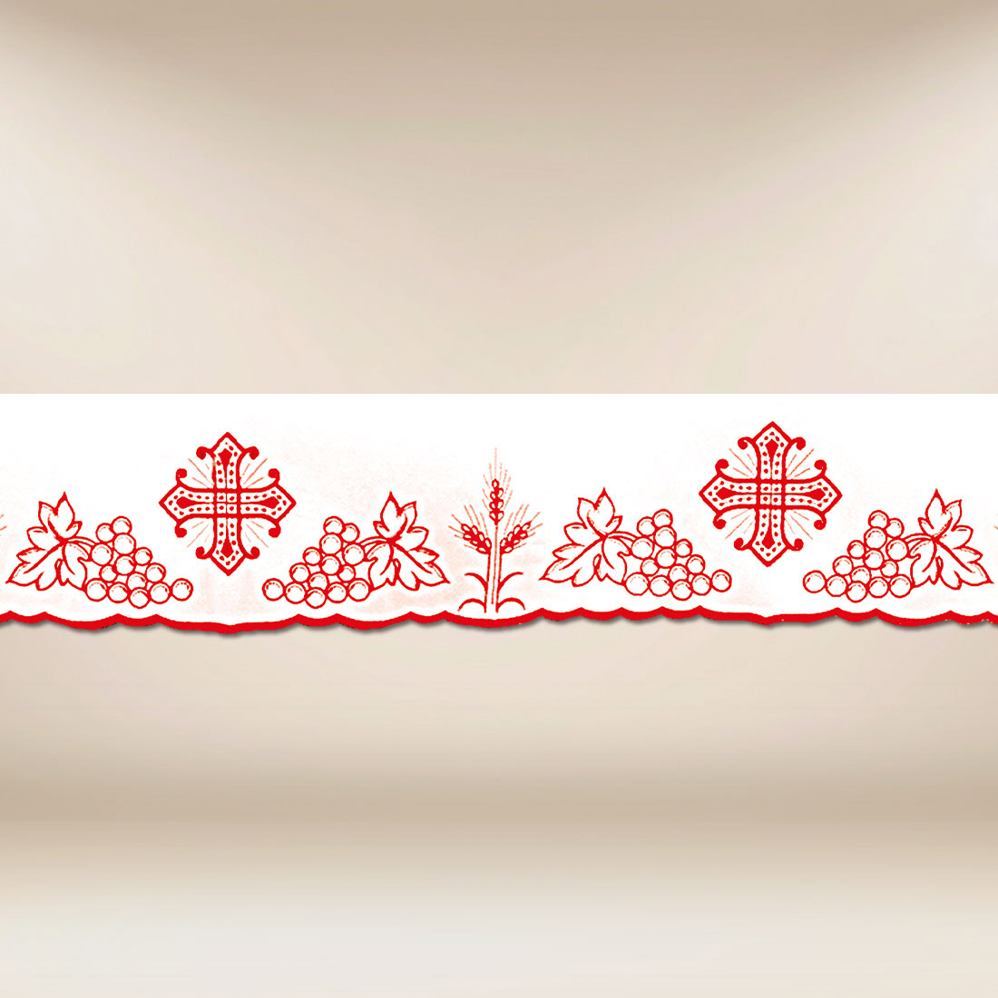 Prezentowana koronka haftowana liturgiczna czerwona „Calvario” w czerwonej wersji kolorystycznej jest wyjątkowym elementem dekoracyjnym przeznaczonym do wykończenia obrusu ołtarzowego. Kompozycja oparta na motywie krzyża, symbolu Męki i Odkupienia, otoczona winogronami i kłosem pszenicy, stanowi bezpośrednie odniesienie do Eucharystii. Ten zapis symboli przypomina wiernym o duchowym znaczeniu liturgii, zwłaszcza w czasie celebracji uroczystości kościelnych.