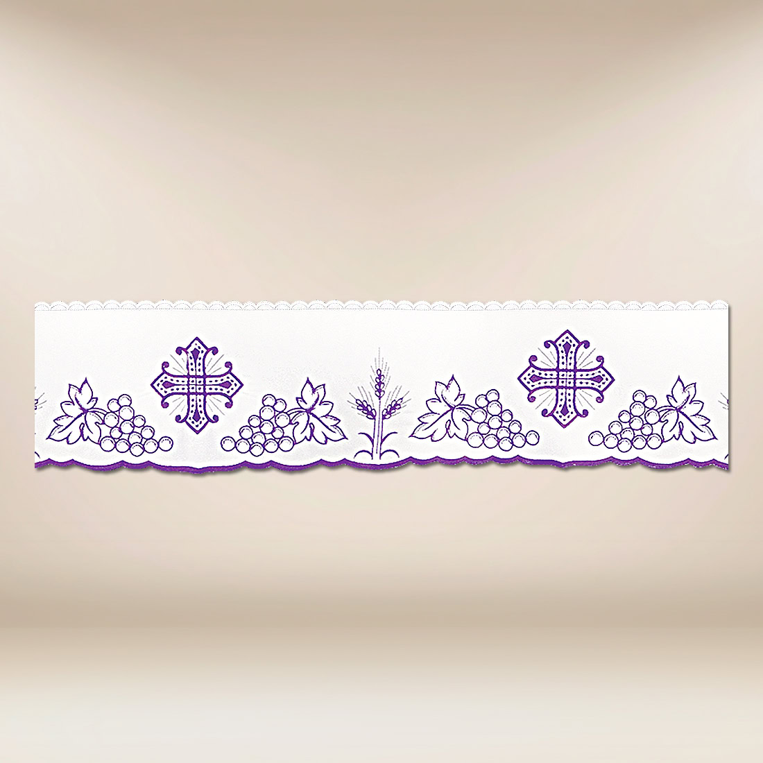 Prezentowana koronka haftowana liturgiczna „Calvario” została zaprojektowana jako eleganckie dopełnienie obrusu ołtarzowego. Wzór oparty na motywie krzyża, winnego grona oraz kłosa pszenicy odwołuje się bezpośrednio do Eucharystii: Chleb i Wino stają się Ciałem i Krwią Chrystusa, a sama dekoracja przypomina wiernym o duchowym znaczeniu liturgii. Subtelny, fioletowy haft wpisuje się w sakralną symbolikę i nadaje całości godny, liturgiczny charakter.