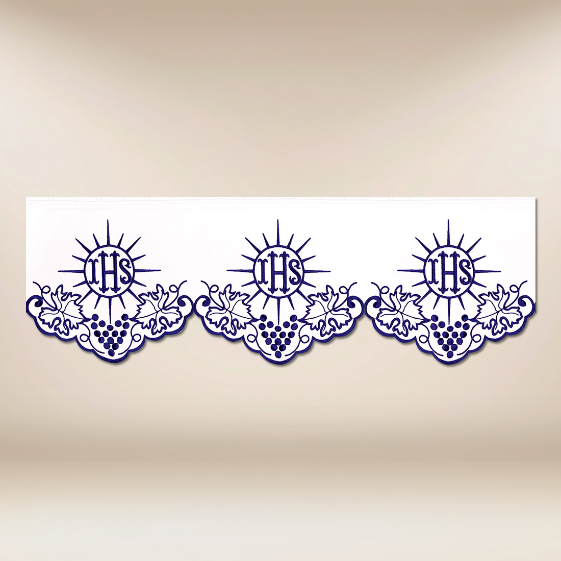 Prezentowana koronka haftowana liturgiczna „Cristiano” fioletowa jest elementem o wyjątkowym znaczeniu symboliczno-estetycznym. Centralny motyw IHS, otoczony roślinnym ornamentem winogron, wskazuje na Eucharystię – sakrament, w którym wierni jednoczą się z Chrystusem. Fiolet wpisuje się w liturgiczny charakter wielu celebracji, akcentując powagę i duchowy wymiar nabożeństw.