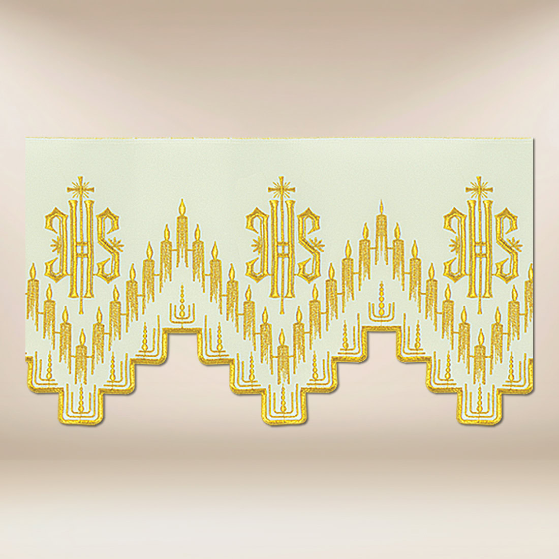 To propozycja dla parafii, które poszukują dekoru o głębokiej symbolice, eleganckim wykończeniu oraz wysokiej jakości wykonania. Motyw IHS w połączeniu z harmonijną formą wzoru pozwala pięknie uzupełnić tekstylia ołtarzowe i nadać celebracji odpowiednią rangę.
