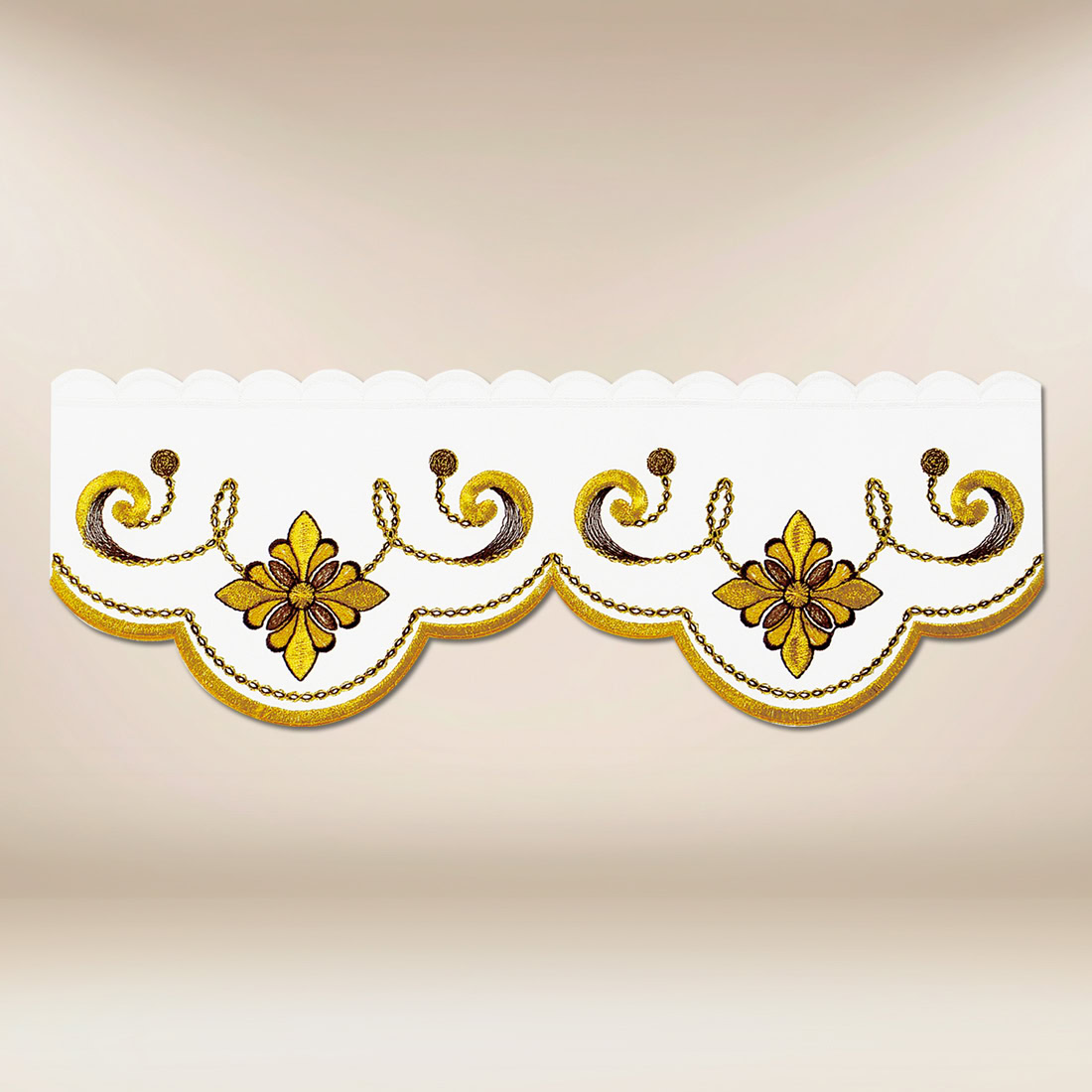 Koronka ołtarzowa haftowana „Gaudete” została zaprojektowana jako eleganckie i harmonijne wykończenie obrusu, nadając przestrzeni liturgicznej wyjątkowy, uroczysty charakter. Ornament roślinny o miękkiej linii oraz drobnych akcentach dekoracyjnych tworzy kompozycję, która świetnie prezentuje się podczas Mszy Świętych i innych celebracji, wprowadzając łagodny rytm i wizualny porządek.