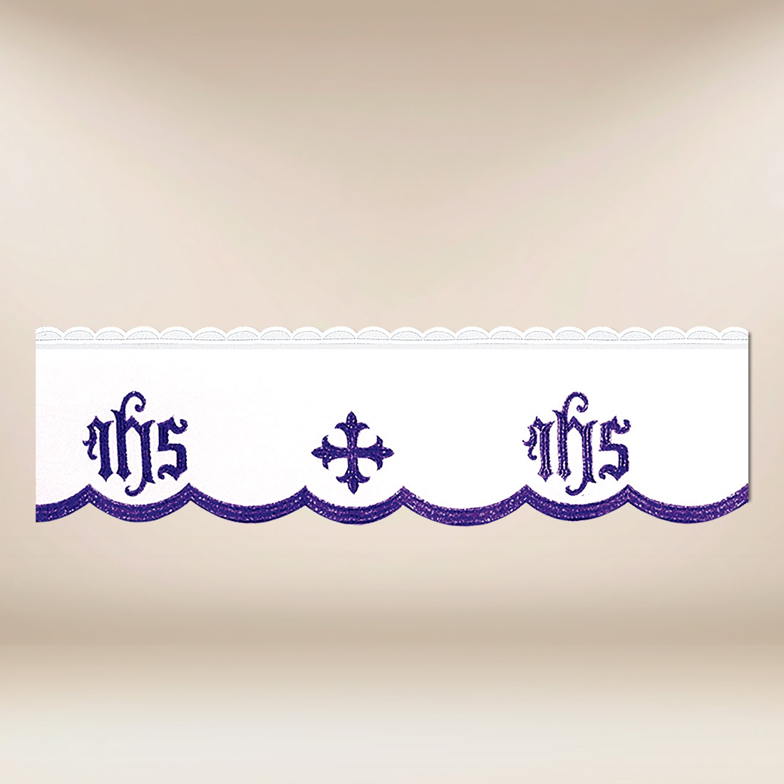 Prezentowana koronka haftowana liturgiczna „Katedralny” fioletowa stanowi eleganckie wykończenie obrusu ołtarzowego, wzbogacając przestrzeń liturgiczną symboliką sakralną. Delikatny wzór oparty na motywie IHS i krzyża jest wyrazistym odniesieniem do Eucharystii — centrum życia Kościoła. Kolor fioletowy podkreśla liturgiczny charakter celebracji, szczególnie w okresach modlitewnego skupienia.