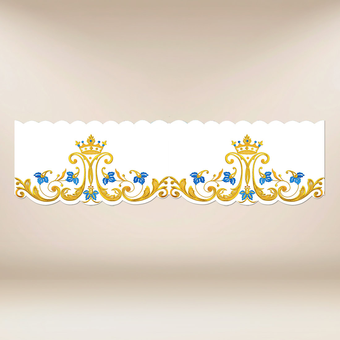 Koronka Maryjna z haftem złoto-niebieskim o wysokości 27 cm to wyjątkowy element dekoracyjny, który łączy klasykę, elegancję i duchowy charakter liturgii. Połączenie złotych i błękitnych nici tworzy harmonijną kompozycję, doskonale podkreślającą piękno przestrzeni sakralnej.