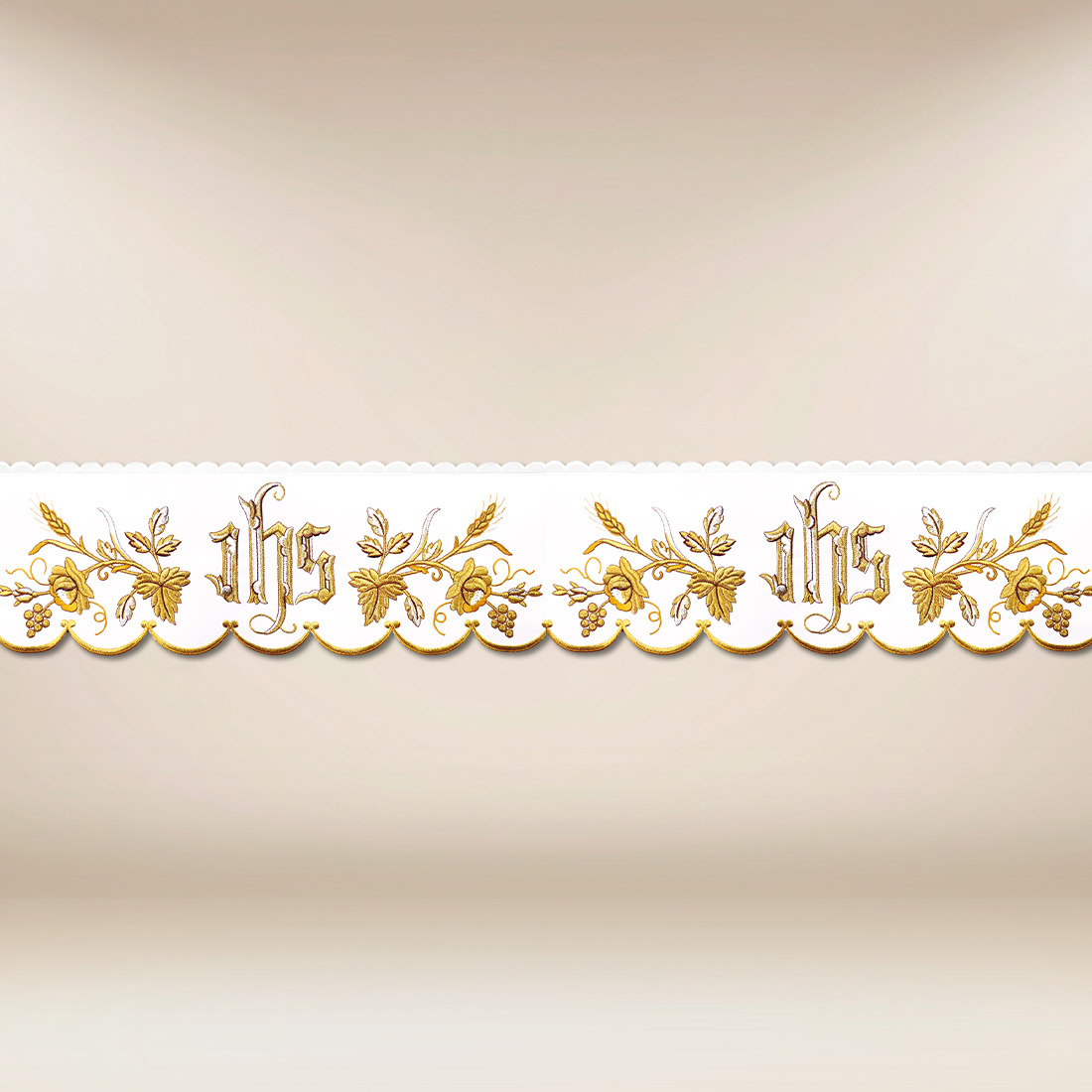 Koronka haftowana z delikatnym złotym haftem to element, który wnosi do przestrzeni liturgicznej subtelną elegancję, harmonię i wyciszony blask tradycji. Jej precyzyjna ornamentyka została opracowana tak, aby podkreślać piękno ołtarza i szat liturgicznych, nie dominując nad nimi, lecz współgrając z całością. To wyrób dopracowany w każdym detalu, powstały dzięki wieloletniemu doświadczeniu i zamiłowaniu do rzemiosła, które w naszej pracowni ma charakter niezmiennie artystyczny.