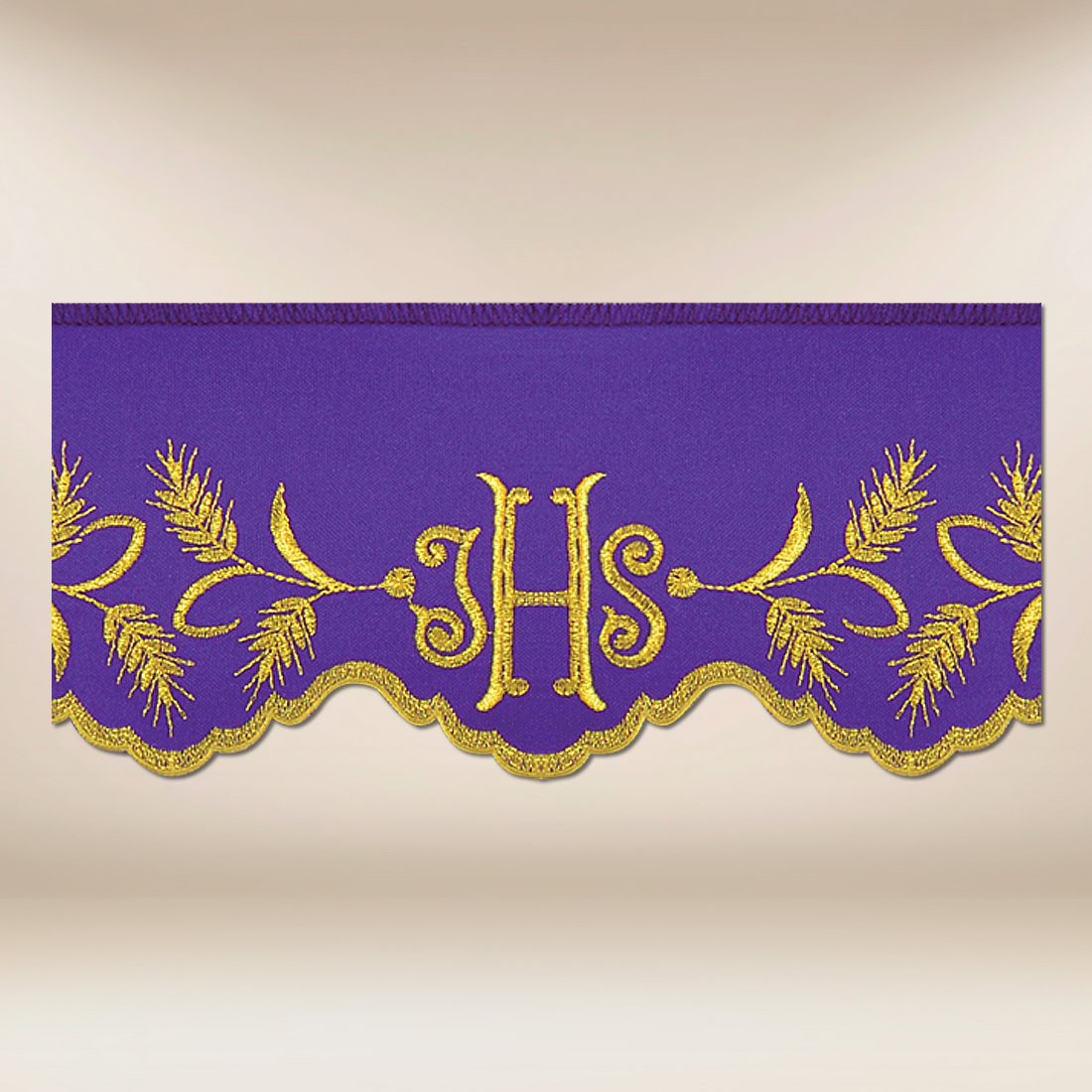 Koronka haftowana sakralna fioletowa 590cm. Motyw IHS otoczony kłosami odnosi się do eucharystycznej symboliki chleba i wprowadza do prezbiterium spójny, podniosły charakter. Ornament haftu jest subtelny, a jednocześnie wyrazisty, dzięki czemu pełni funkcję ozdobną bez dominowania nad aranżacją.
