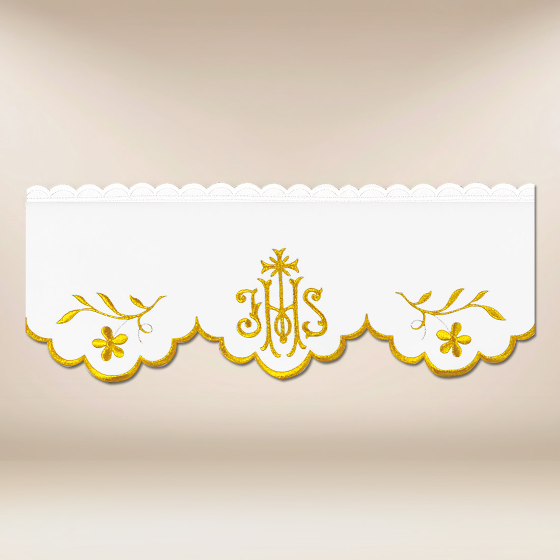Koronka haftowana „Złota Seria” wykonana z wysokiej jakości tkaniny poliestrowej (100%) to elegancki i trwały element dekoracyjny ołtarza.