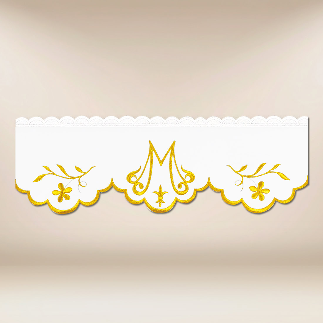 Zdobiona złotym haftem Maryjnym o wysokości 11 cm, subtelnie podkreśla piękno i sakralny charakter wnętrza świątyni.