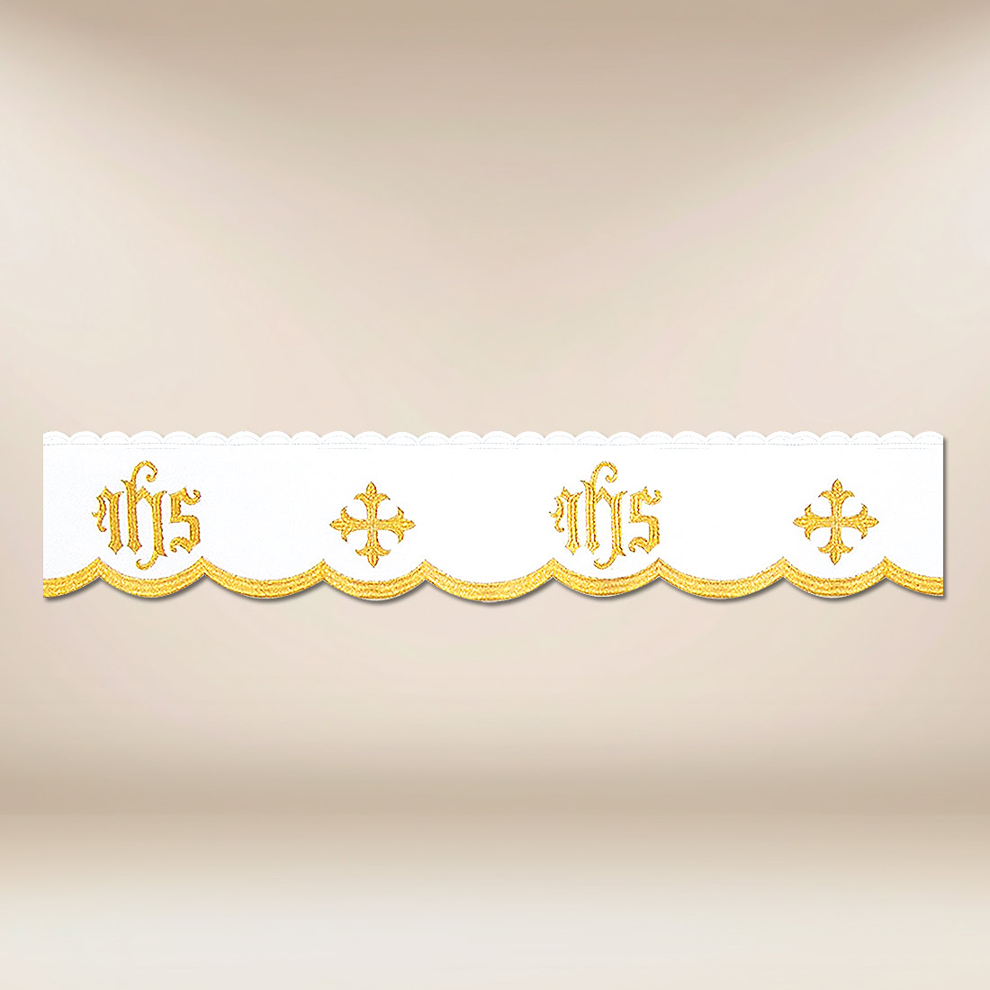 Koronka haftowana sakralna “Katedralny Złota” to klasyczne wykończenie liturgiczne o eleganckiej formie, zaprojektowane w duchu rzetelnej tradycji sakralnej. Centralny motyw IHS, symbolizujący imię Jezus, połączono z delikatnym krzyżem, tworząc kompozycję o głębokiej wymowie teologicznej. Haft o wysokości 14 cm jest odpowiednio wyważony – czytelny i proporcjonalny, dzięki czemu pięknie prezentuje się zarówno z bliska, jak i z dalszej perspektywy w świątyni.