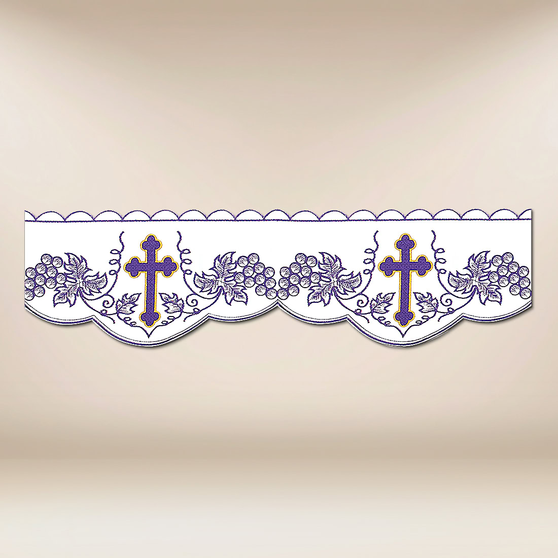 Prezentowana Koronka Haftowana Na Post została stworzona jako eleganckie wykończenie obrusu ołtarzowego na czas Wielkiego Postu. Dominujący symbol krzyża przywołuje refleksję nad Męką Chrystusa, a motyw winorośli jest wyrazistym odniesieniem do Eucharystii, jedności duchowej i sakralnego wymiaru liturgii. Fioletowo-złoty haft podkreśla liturgiczny charakter tego okresu, wprowadzając atmosferę skupienia i modlitewnej zadumy.