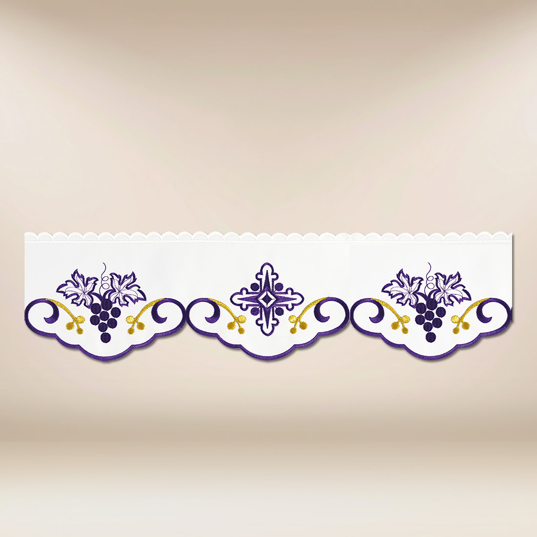 Koronka haftowana z fioletowym haftem o wysokości 14 cm jest wyrafinowanym elementem tekstyliów ołtarzowych, stworzonym z myślą o liturgii, w której znaczenie ma zarówno symbol, jak i estetyczna harmonia. Kompozycja oparta na motywie winnego grona oraz centralnie umieszczonym krzyżu nawiązuje do Eucharystii, stanowiąc czytelne, a zarazem subtelne odniesienie do tajemnicy Ofiary.