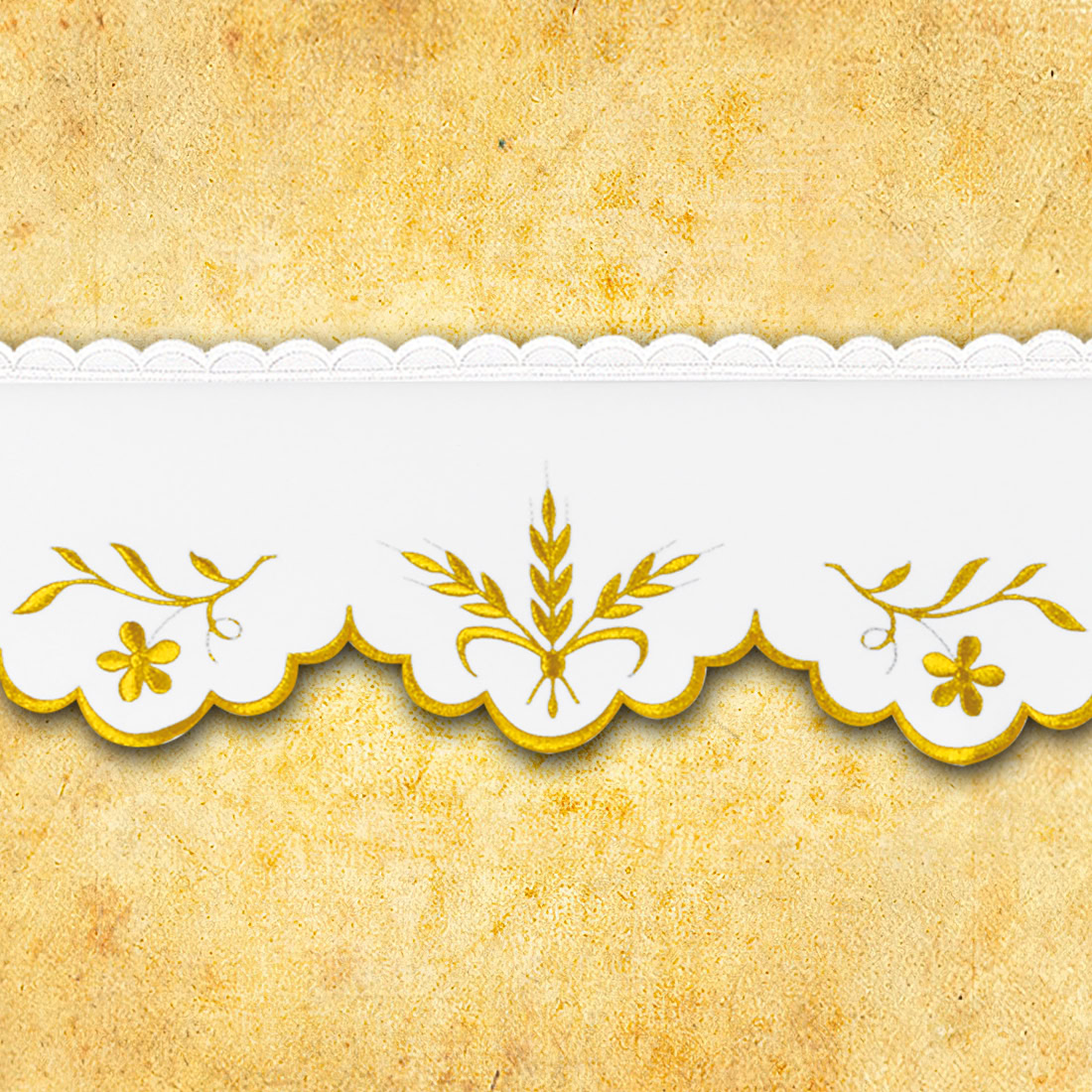 Koronka haftowana „Złota Seria” wykonana z wysokiej jakości tkaniny poliestrowej (100%) to elegancki i trwały element dekoracyjny ołtarza.