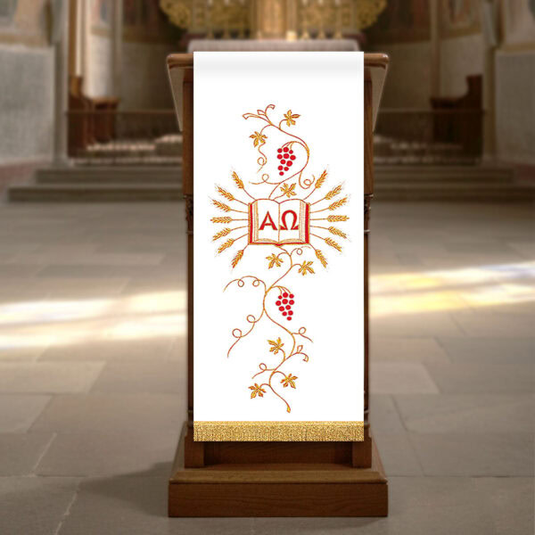Lektorium wykonane z wysokiej jakości tkaniny, gładkiej, plamoodpornej, 100% poliester. Można prać i prasować. Na dole doszyte złote frędzle.