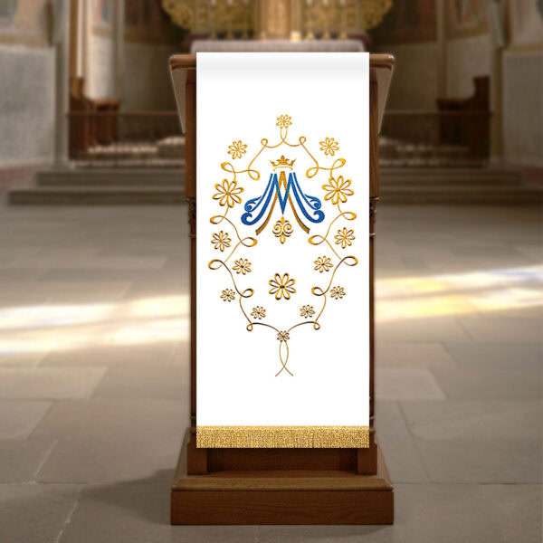 Lektorium wykonane z wysokiej jakości tkaniny, gładkiej, plamoodpornej, 100% poliester. Można prać i prasować. Na dole doszyte złote frędzle.