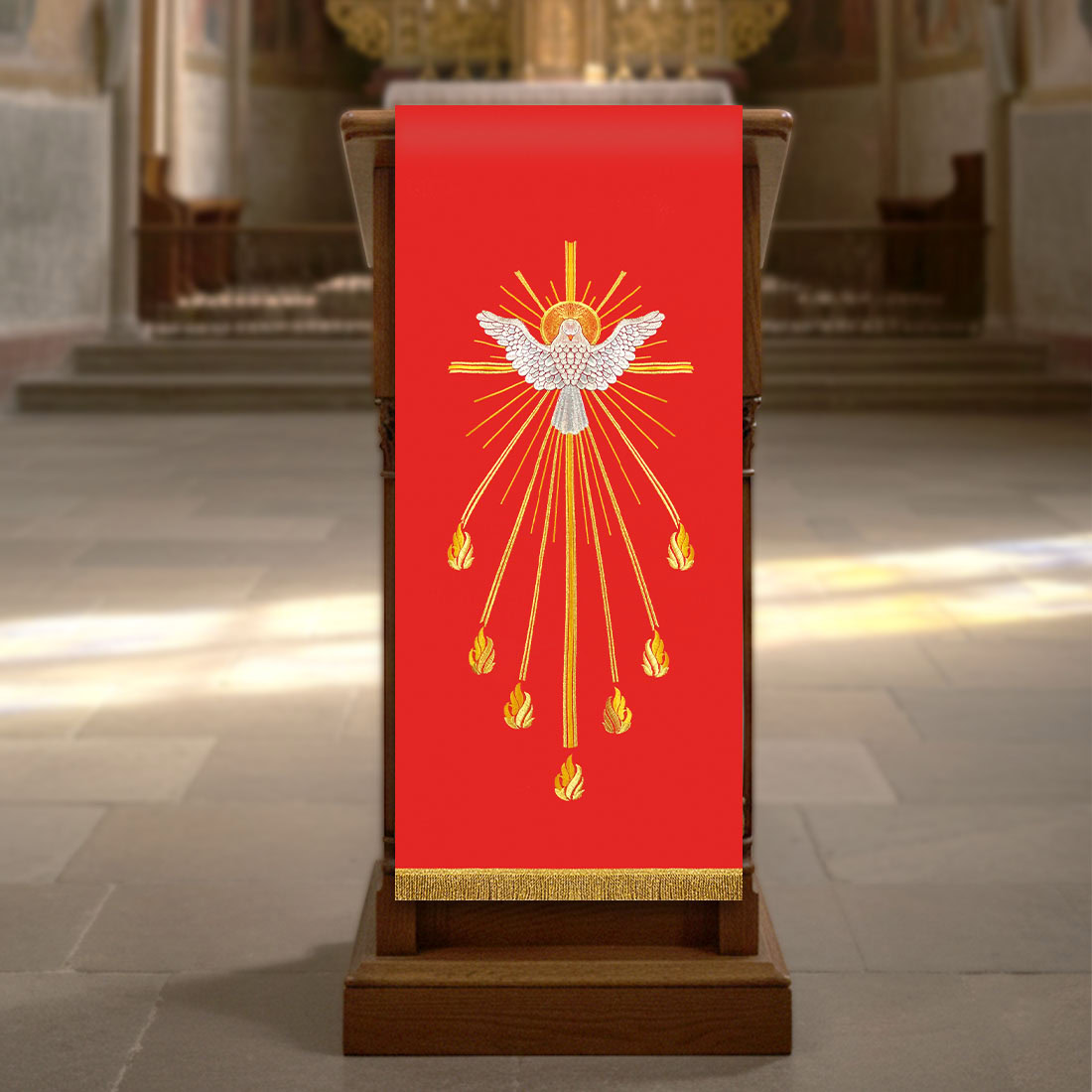 Dzięki wymiarom 55 × 150 cm, lektorium idealnie sprawdza się jako nakrycie pulpitu, ambony lub mównicy w świątyni. Lektorium Haftowane czerwone Duch Święty podkreśla ceremonie.