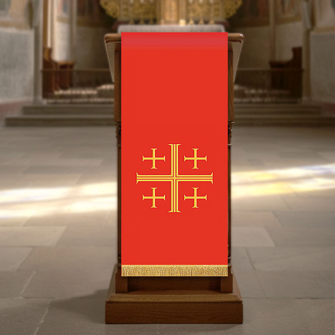 Lektorium wykonane z wysokiej jakości tkaniny elany kolorowej, gładkiej. Można prać i prasować. Na dole doszyte złote frędzle.