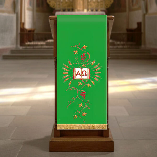 Lektorium wykonane z wysokiej jakości tkaniny elany kolorowej, gładkiej. Można prać i prasować. Na dole doszyte złote frędzle.