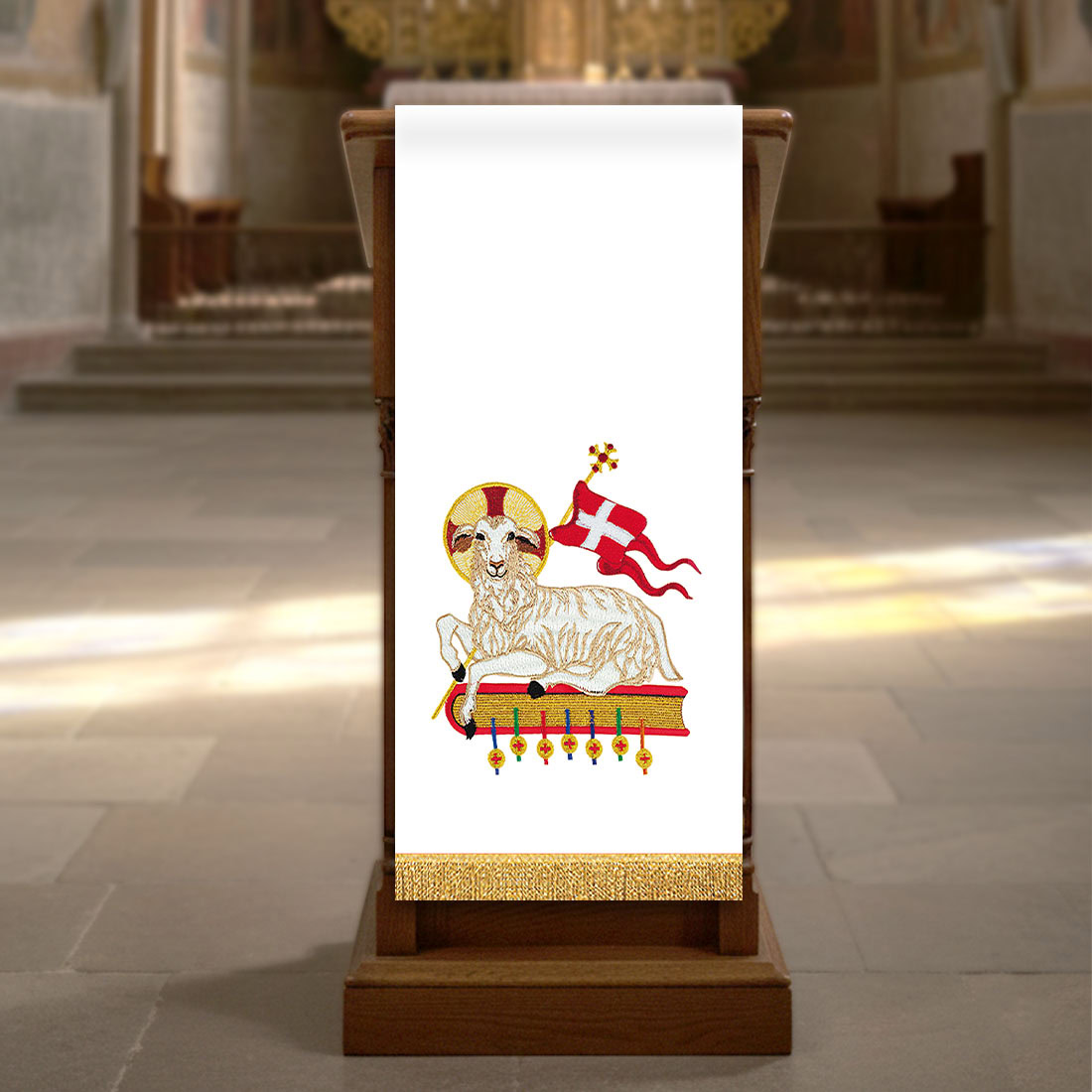 Lektorium wykonane z wysokiej jakości tkaniny, gładkiej, plamoodpornej, 100% poliester. Można prać i prasować. Na dole doszyte złote frędzle.
