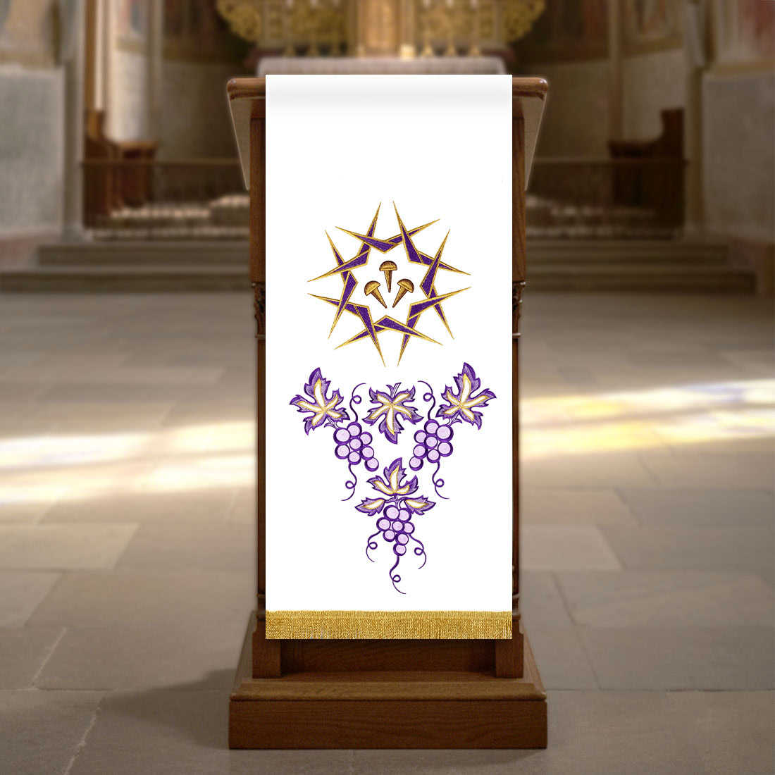 Lektorium haftowane postne to starannie zaprojektowany element dekoracji liturgicznej, przeznaczony do podkreślenia wyjątkowego charakteru okresu Postu. Umieszczone na lektorium staje się czytelnym znakiem duchowego przygotowania na przyjście Chrystusa, wprowadzając wiernych w klimat ciszy, refleksji i modlitwy. Jego proporcje – 55 cm x 150 cm – sprawiają, że doskonale prezentuje się na ambonie, zachowując harmonię z wystrojem prezbiterium.