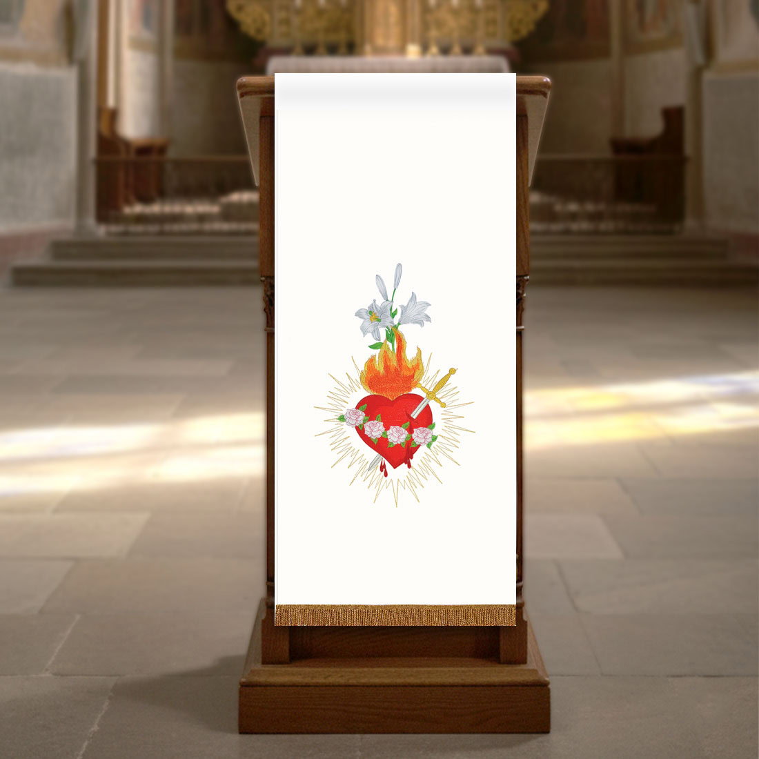 Lektorium wykonane z wysokiej jakości tkaniny białej, gładkiej, plamoodpornej, 100% poliester. Można prać i prasować. Na dole doszyte złote frędzle.