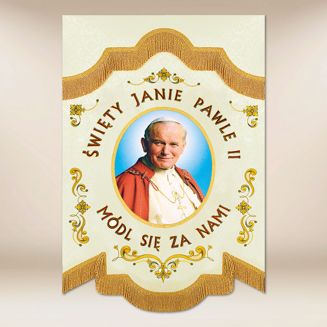 Mini Chorągiew Dwustronna Jan Paweł II to wyjątkowa propozycja dla wspólnot, które pragną wprowadzić do przestrzeni sakralnej jeszcze więcej godności i piękna. Mini chorągiew została przygotowana z myślą o procesjach, uroczystościach parafialnych oraz stałej ekspozycji w świątyni. W pierwszym planie znajduje się wizerunek św. Jana Pawła II, który staje się zaproszeniem do modlitwy i refleksji.