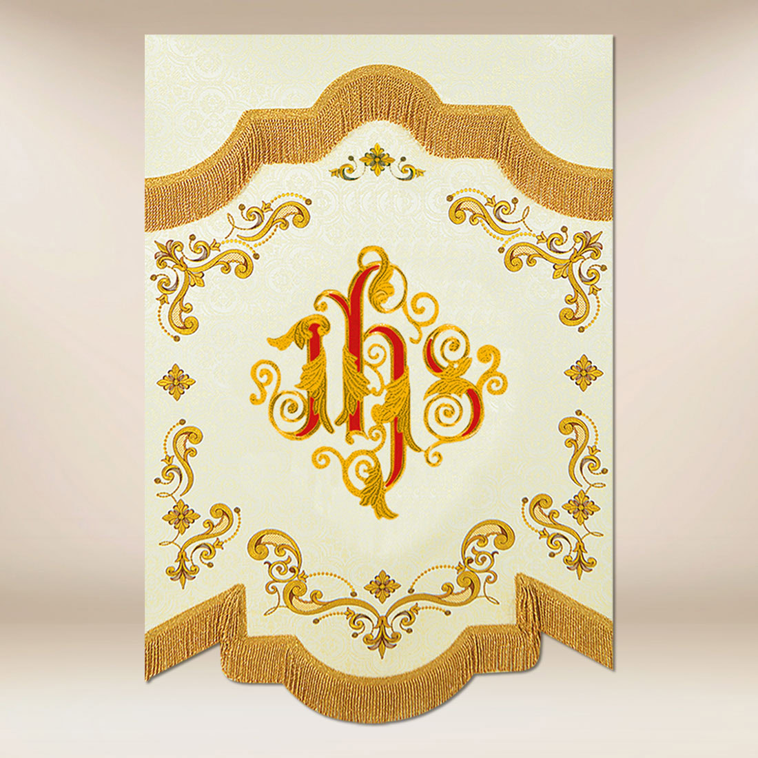 Dwustronna konstrukcja chorągwi zapewnia efektowną prezentację z każdej strony, co jest szczególnie istotne podczas procesji i uroczystych liturgii. Starannie dobrane zdobienia, subtelne ornamenty i dekoracyjne frędzle nadają chorągwi uroczysty charakter, zachowując jednocześnie harmonię i elegancję. Materiały użyte do wykonania produktu, w tym trwały żakard, gwarantują stabilność i estetyczny wygląd nawet przy częstym użytkowaniu, a solidne szycie zapewnia długotrwałą trwałość.