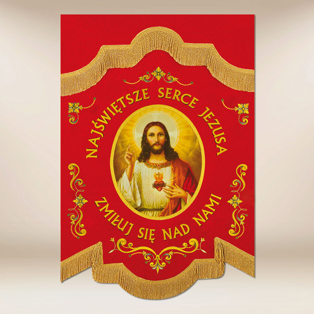 Mini Chorągiew Dwustronna Serce Jezusa to elegancka dekoracja sakralna z wizerunkiem Najświętszego Serca Jezusa. Dwustronny haft, subtelne zdobienia i złote frędzle nadają jej uroczysty, liturgiczny charakter, idealny do procesji, nabożeństw i stałej ekspozycji w kościołach i kaplicach.