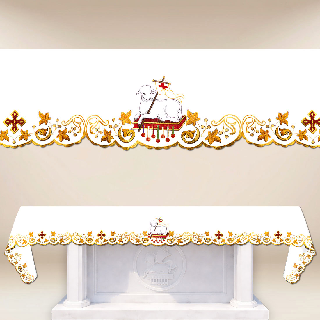 Obrus prezentuje się dostojnie zarówno w przestrzeni prezbiterium, jak i podczas szczególnie uroczystych celebracji roku liturgicznego. Dbałość o precyzję wykonania, wyraźny rysunek detalu oraz harmonijna całość sprawiają, że jest to tekstylia ołtarzowa przeznaczona do godnej oprawy Najświętszej Ofiary.