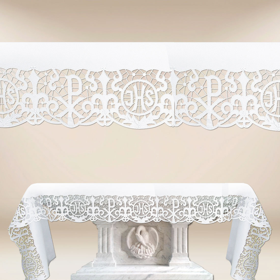 Piękny obrus haftowany haft biały motyw IHS to elegancka i funkcjonalna dekoracja liturgiczna, stworzona z myślą o ołtarzach i wnętrzach kościelnych, które wymagają uroczystego i godnego wykończenia. Centralny motyw IHS, precyzyjnie wykonany białym haftem o wysokości 23 cm, symbolizuje imię Jezusa Chrystusa i wprowadza do przestrzeni kościelnej atmosferę sacrum, spokoju oraz duchowej harmonii. Haft został wykonany z dbałością o każdy detal, dzięki czemu jest wyraźny, elegancki i trwały, a obrus prezentuje się doskonale zarówno z bliska, jak i z dalszej odległości.