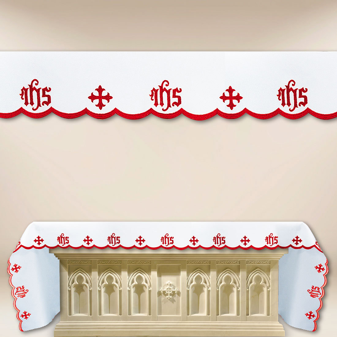 Obrus ołtarzowy haftowany “Katedralny” Czerwony – na dowolny wymiar to klasyczna dekoracja prezbiterium, którą wyróżnia połączenie wysokiej estetyki oraz czytelnej symboliki eucharystycznej. Motyw IHS oraz krzyży wpisany w elegancką linię haftu podkreśla wymowę liturgii i buduje klimat modlitwy oraz skupienia.