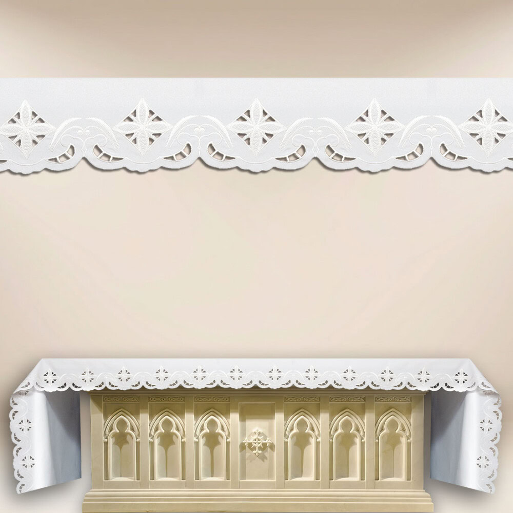Obrus wykonano z wysokogatunkowej tkaniny poliestrowej o właściwościach plamoodpornych, co ma ogromne znaczenie przy jego codziennym użytkowaniu. Tkanina jest trwała, łatwa w pielęgnacji i zachowuje swój wygląd nawet po wielokrotnym praniu. Dzięki opcji wykonania na dowolny wymiar obrus można precyzyjnie dopasować do każdego typu ołtarza – zarówno głównego, jak i bocznego.