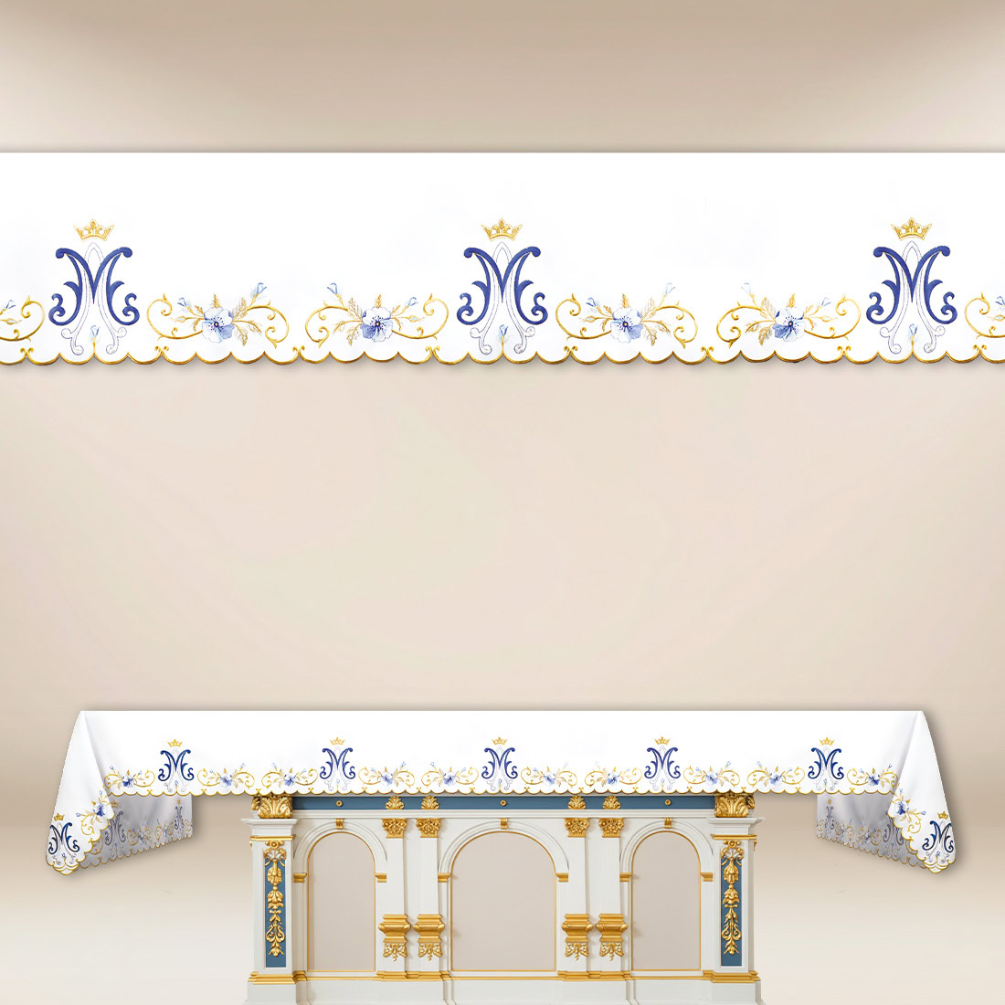 Obrus liturgiczny maryjny wykonany z wysokiej jakości tkaniny poliestrowej 100%.