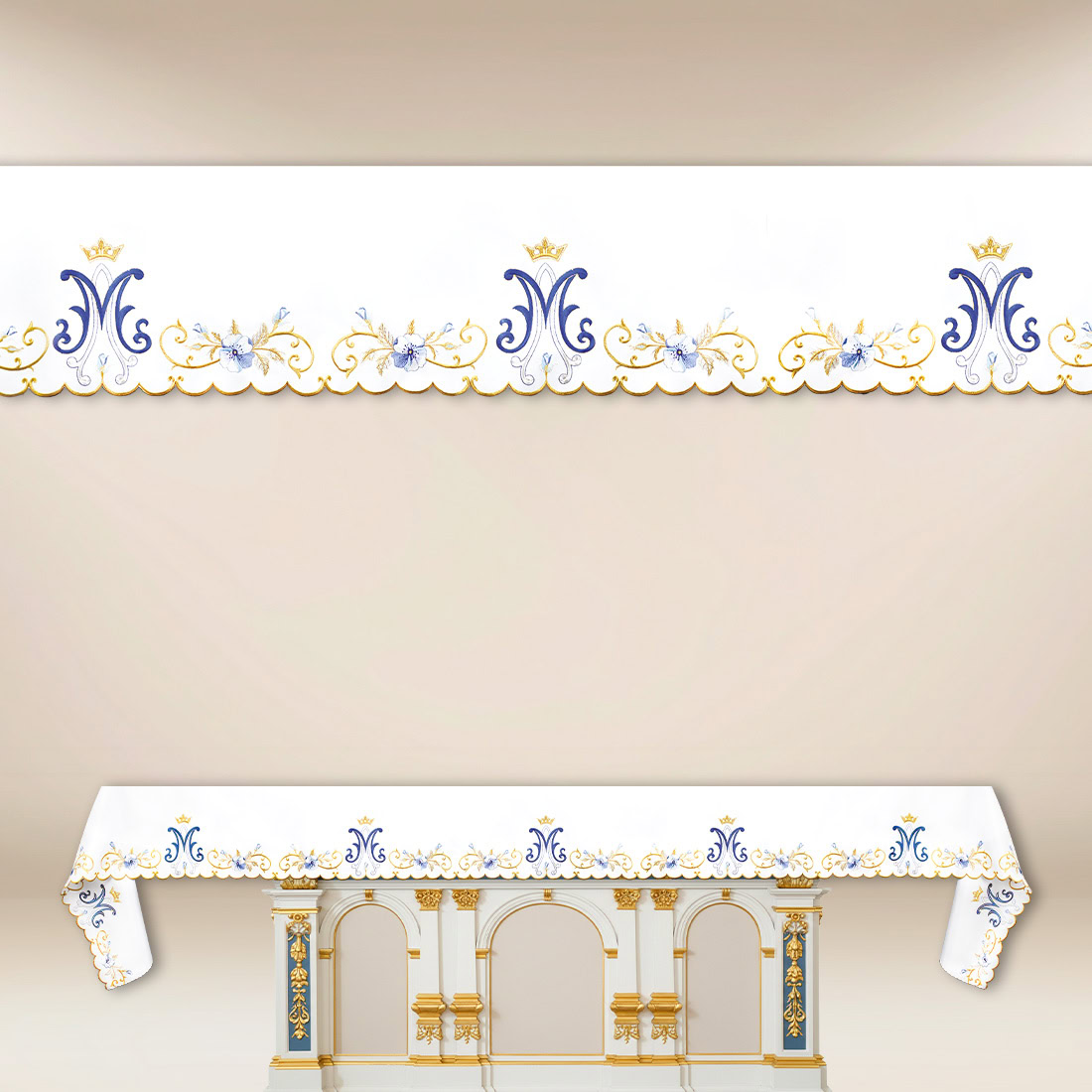 Obrus liturgiczny maryjny wykonany z wysokiej jakości tkaniny poliestrowej 100%.