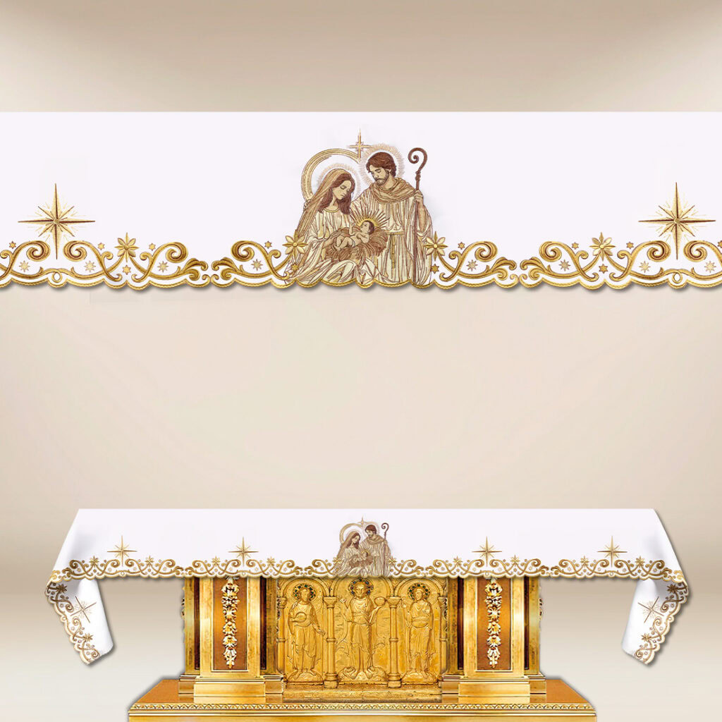 Obrus haftowany Bożonarodzeniowy „Sacro Natale” łączy elegancję dekoracyjną z praktycznym zastosowaniem w świątyniach. Wykonany z wysokiej jakości tkaniny poliestrowej o właściwościach plamoodpornych, stanowi trwałe i reprezentacyjne nakrycie ołtarza. Wysokość haftu wynosi 30 cm, co sprawia, że motyw jest wyrazisty, czytelny i estetycznie wpisuje się w przestrzeń prezbiterium. Obrus dostępny jest w długości do 650 cm, dzięki czemu doskonale sprawdzi się zarówno w kościołach parafialnych, jak i kaplicach zakonnych — również przy ołtarzach o nietypowych wymiarach.