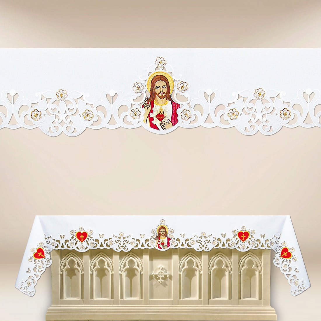 Symbolika Najświętszego Serca Pana Jezusa od wieków kojarzona jest z bezwarunkową miłością Chrystusa, Jego miłosierdziem i duchową opieką nad wiernymi. Ażurowe wykończenia oraz starannie zaprojektowany haft niosą przesłanie o głębokim wymiarze liturgicznym, podkreślając charakter Eucharystii i nabożeństw do Serca Jezusowego. Ten obrus haftowany liturgiczny stanowi piękny akcent, który wprowadza atmosferę modlitewnego skupienia i sakralnej harmonii.