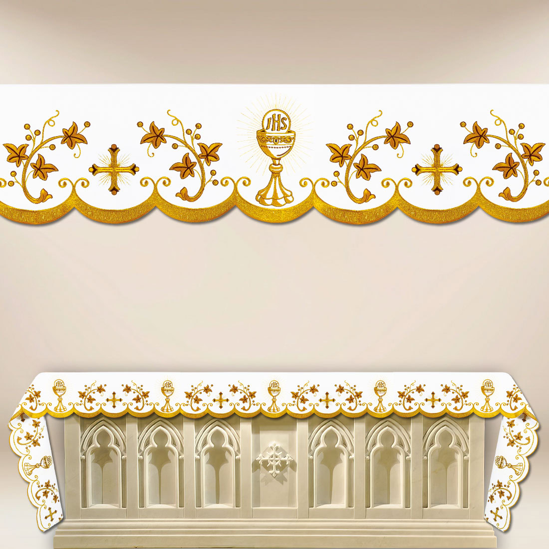 Obrus liturgiczny „Złota Seria Kielich” wykonany z wysokiej jakości, plamoodpornej tkaniny poliestrowej (100%).