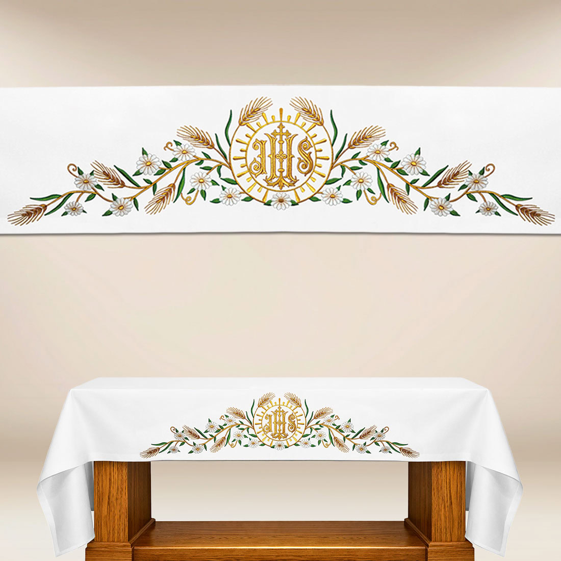 Obrus z haftem IHS stanowi piękny przykład sakralnego wzornictwa, które jednocześnie zachowuje elegancję i głębię teologiczną. Centralny monogram IHS – skrót Imienia Jezus – otoczony został ornamentem z kłosów zbóż, roślin oraz subtelnych zdobień. Zestawienie to przywołuje Eucharystię, Misterium obecności Chrystusa oraz symbol przemiany chleba w Ciało Pańskie. Motyw haftu jest wyrazisty, czytelny i znakomicie wpisuje się w liturgiczną tradycję Kościoła.