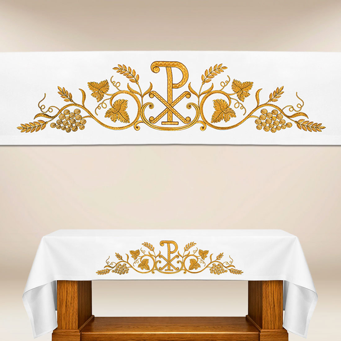 Obrus ołtarzowy haftowany PX łączy w sobie symboliczną głębię i klasyczną elegancję, którą od wieków w liturgii Kościoła podkreśla znak Chrystusa. Ornament oparty na motywie kłosów i winogron nawiązuje do Eucharystii, gdzie chleb oraz wino stają się Ciałem i Krwią Pańską. Dzięki temu obrus ten nie tylko zdobi, ale też przypomina o centralnej tajemnicy wiary.