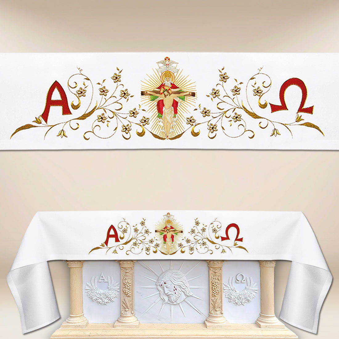 Obrus ołtarzowy z haftem czołowym przedstawiającym Trójcę Świętą jest jedną z najbardziej okazałych tekstyliów sakralnych, jakie oferujemy. Centralny motyw ukazuje Trójcę Świętą w otoczce blasku, a po obu jego stronach umieszczono litery Alfa i Omega – znak początku i końca, potężny symbol teologiczny przypominający o Bogu jako Stwórcy i Panu czasu. Ornamenty kwiatowe delikatnie spajają całą kompozycję, tworząc duchową harmonię.