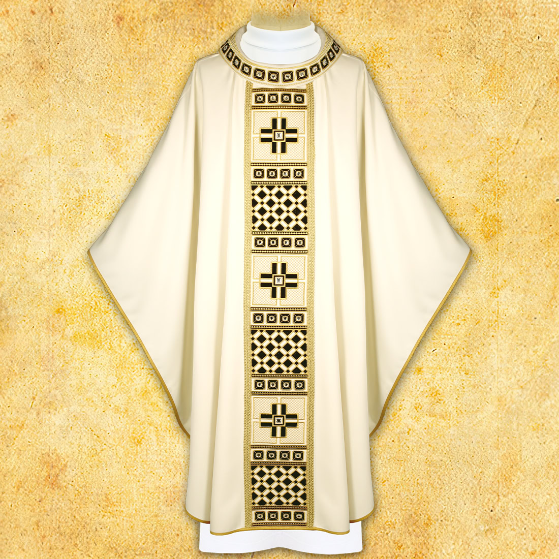 Centralny pas haftowany, biegnący pionowo przez całą długość ornatu, oparty jest na symetrycznych motywach inspirowanych tradycyjnym wzornictwem sakralnym. Geometryczne zdobienia przeplatane złotymi akcentami tworzą harmonijną kompozycję, która podkreśla pionową linię szaty i dodaje jej lekkości. Haft powtarza się również przy kołnierzu, co wzmacnia spójność i elegancję całego projektu. Ornament jest wyważony, piękny, ale nieprzesadny — wpisuje się w estetykę spokojnej, codziennej liturgii.