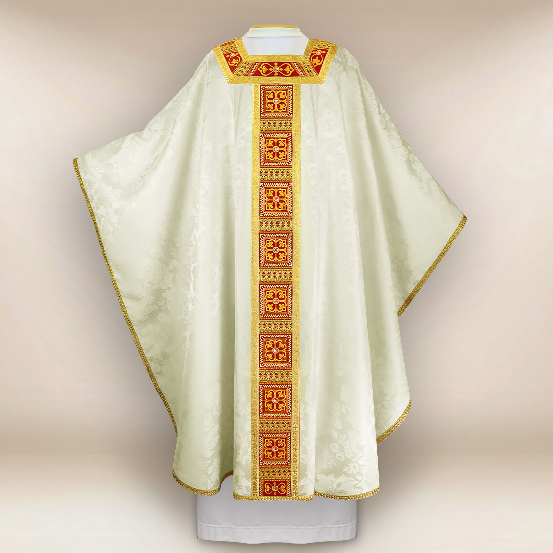 Centralną część szaty zdobi bogaty galon haftowany złotą nicią. Każdy element dekoracji został wykonany z dużą precyzją, a kompozycję dopełniają ręcznie osadzane kamienie, które dodają szacie blasku i tworzą elegancką grę światła. Takie połączenie tradycyjnego haftu i misternych zdobień nadaje ornatowi wyjątkowy, reprezentacyjny charakter, nie tracąc przy tym liturgicznej powagi.