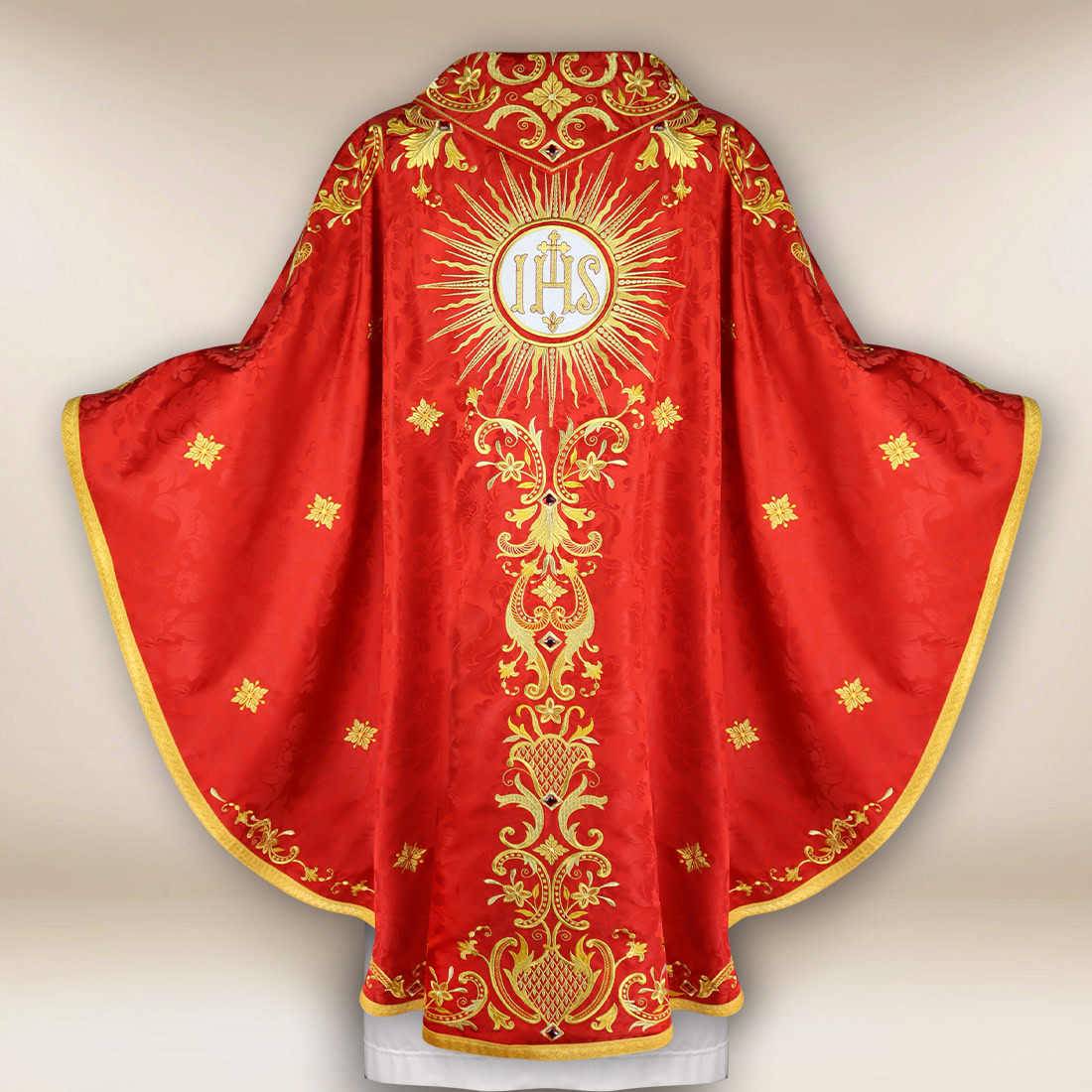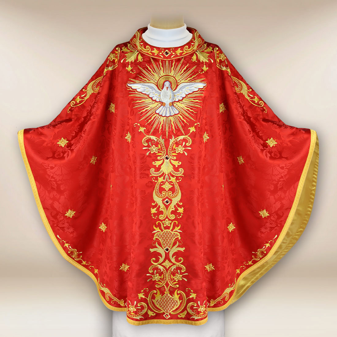 Elegancki ornat haftowany czerwony Duch Święty został zaprojektowany jako uroczysta szata liturgiczna przeznaczona na celebracje, w których szczególnie podkreśla się działanie Ducha Świętego oraz teologię ognia, światła i miłości. To model stworzony z myślą o podniosłych uroczystościach kościelnych, takich jak Zesłanie Ducha Świętego czy sakrament Bierzmowania, a także liturgie biskupie i święta męczenników.