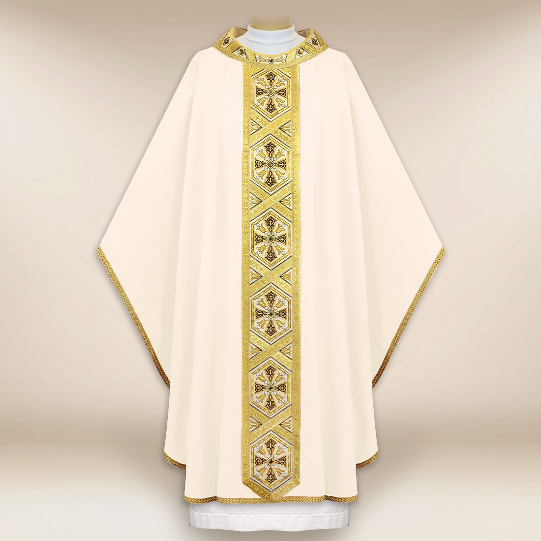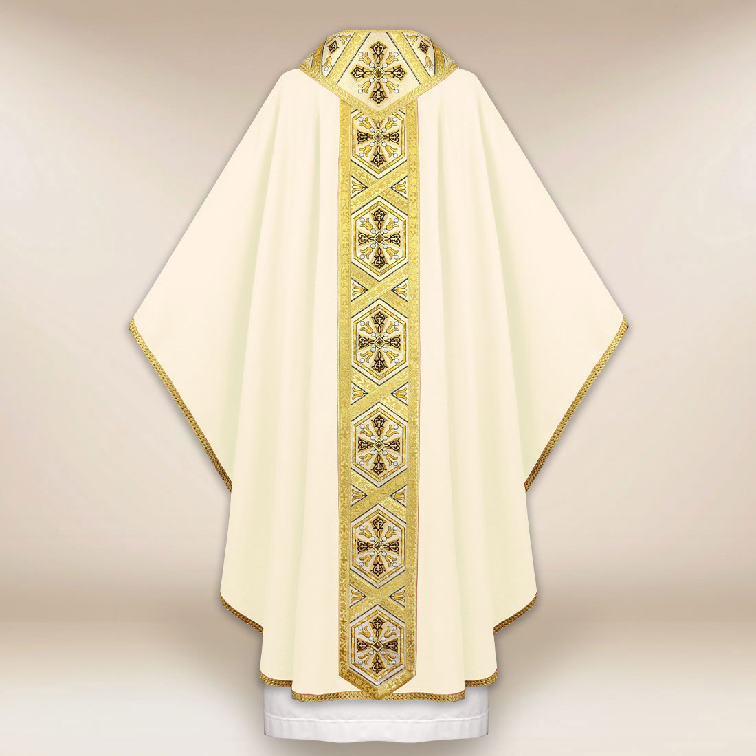 Dopracowany w każdym szczególe ornat haftowany ecru z krzyżami to propozycja dla kapłanów poszukujących jasnej, eleganckiej i symbolicznie czytelnej szaty liturgicznej.