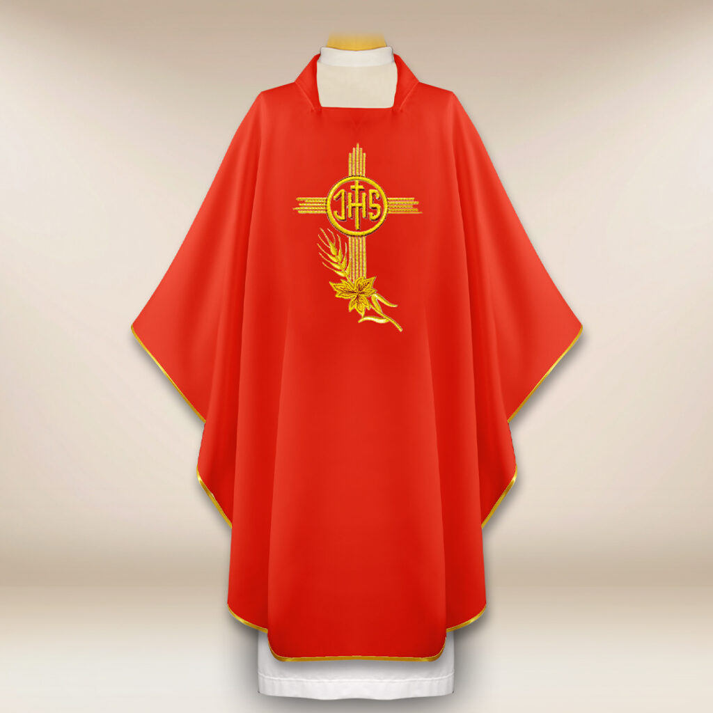 Liturgiczny ornat haftowany z IHS czerwony to połączenie prostoty, elegancji i duchowego przesłania, które pięknie towarzyszy modlitwie i liturgii.