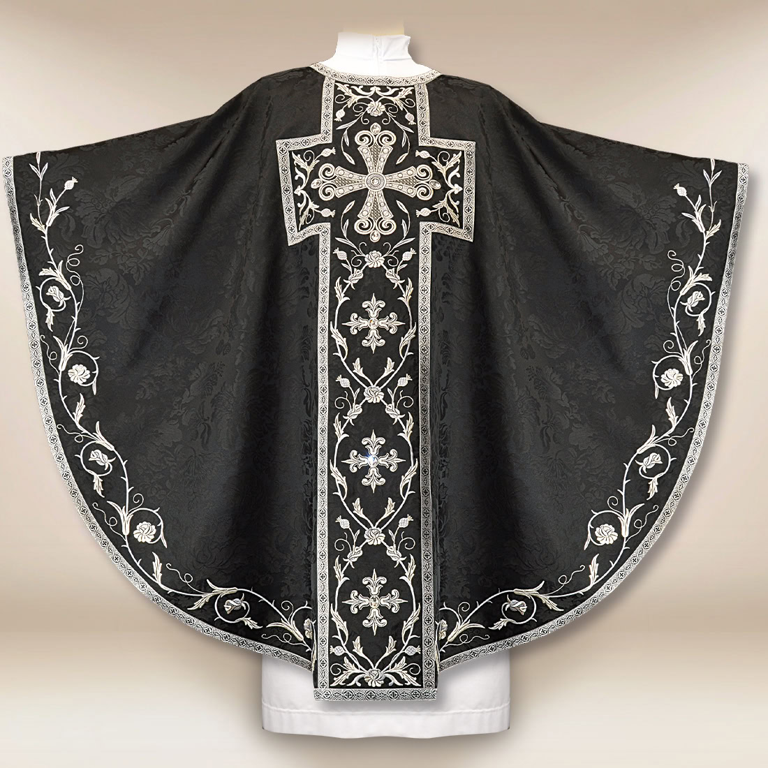 Wnętrze szaty odszyto złotą atłasową podszewką, która wnosi ciepły akcent do surowej palety czerni i srebra oraz podkreśla rangę liturgiczną tej szaty. Haft z tyłu został wykonany w identycznej formie jak z przodu, co nadaje całości symetrii, harmonii i pełnego wykończenia niezależnie od perspektywy. W zestawie znajduje się dopasowana stuła wewnętrzna wykonana z tej samej tkaniny, tworząc spójny komplet liturgiczny.