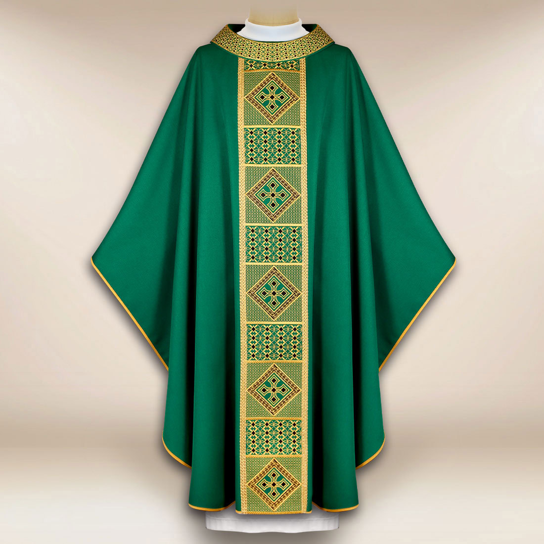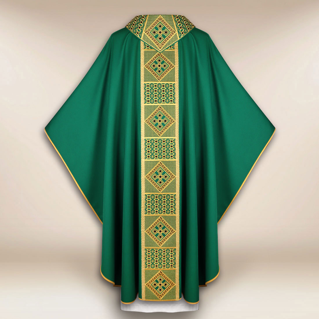 W drugiej części kompozycji model „Mistero” ukazuje swój pełny charakter — to ornat, który sprawdza się zarówno podczas liturgii codziennych, jak i uroczystych celebracji, w których potrzebna jest atmosfera podniosłości połączona z umiarem. Symbolika zieleni w połączeniu z klasycznym wzornictwem tworzy szatę o ponadczasowym wyrazie, wpisującą się w tradycję Kościoła.