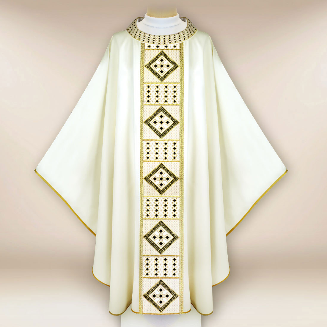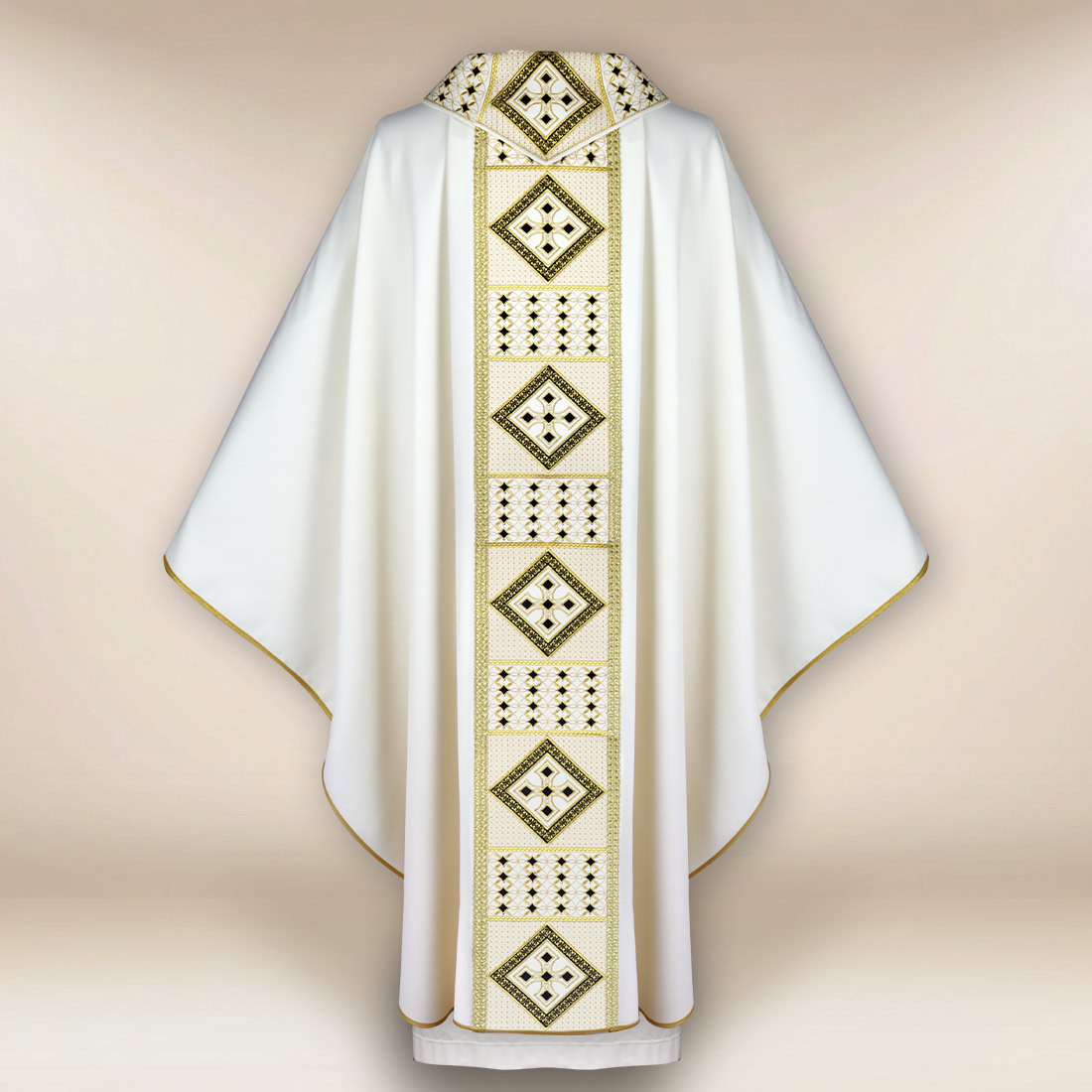 Centralną część szaty zdobi dekoracyjny pas z precyzyjnym haftem o motywach geometryczno-roślinnych. Ornament wykonany złotą nicią został opracowany tak, aby zachować równowagę i elegancję bez zbędnej przesadności. Wyważona forma wzoru pięknie prowadzi linię szaty, nadając jej głębi i harmonijnego rytmu, jednocześnie subtelnie podkreślając uroczysty charakter koloru ecru. Złote nici delikatnie odbijają światło, co sprawia, że ornat prezentuje się bardzo szlachetnie w przestrzeni prezbiterium.