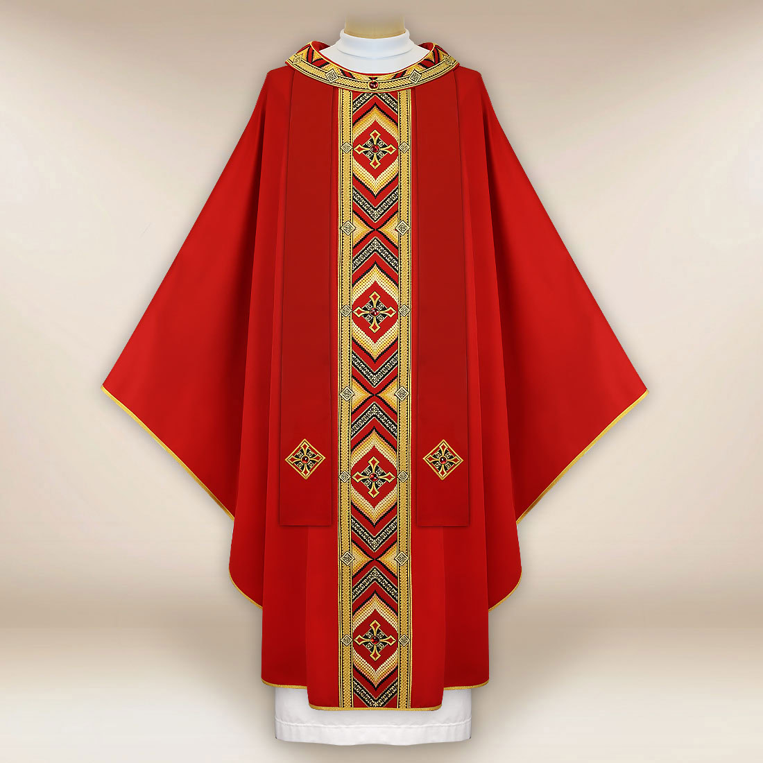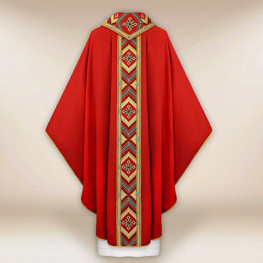 Bogato haftowany ornat czerwony “Moderno Carisma” to wyjątkowa szata liturgiczna zaprojektowana z myślą o celebracjach wymagających piękna, elegancji i bogatej symboliki. Charakterystyczny pas ozdobiony złotą nicią tworzy harmonijną kompozycję, łącząc w sobie klasyczne motywy liturgiczne z nowoczesną estetyką. Haft dopełniają ręcznie aplikowane kamienie, które subtelnie odbijają światło, nadając szacie uroczystego blasku. Całość podkreśla ozdobny kołnierz utrzymany w tej samej stylistyce, tworzący spójny, reprezentacyjny wygląd.