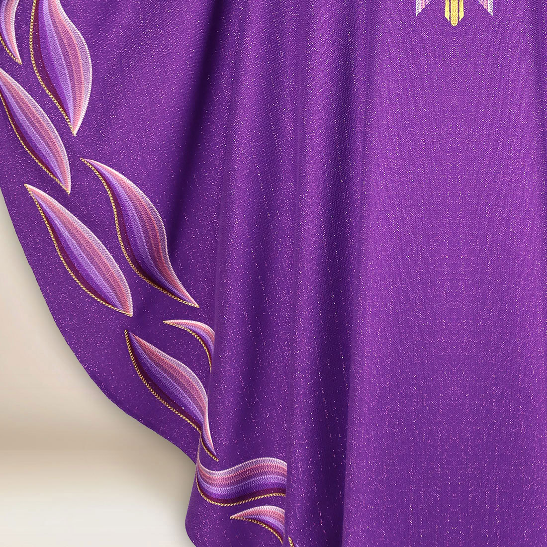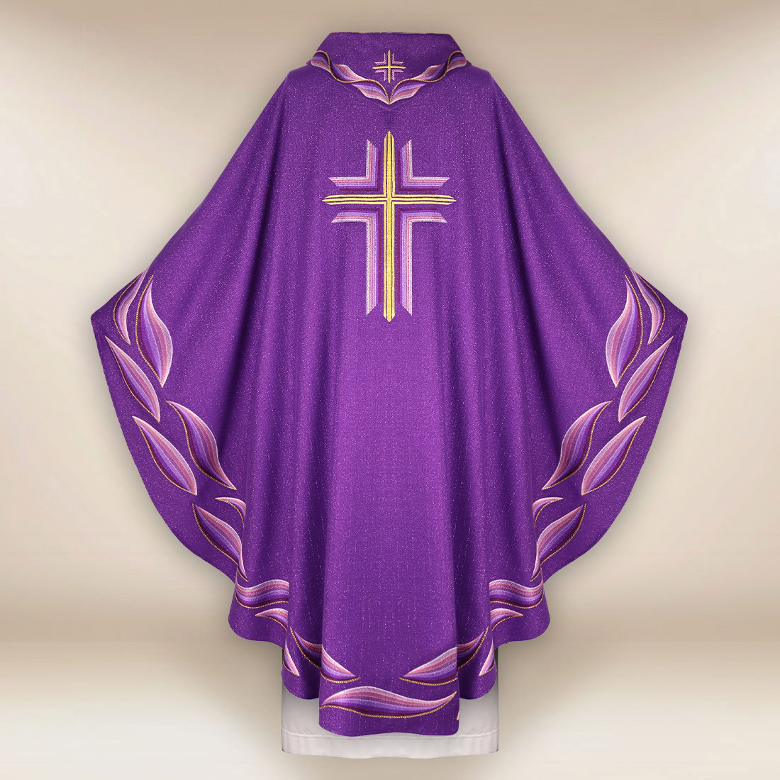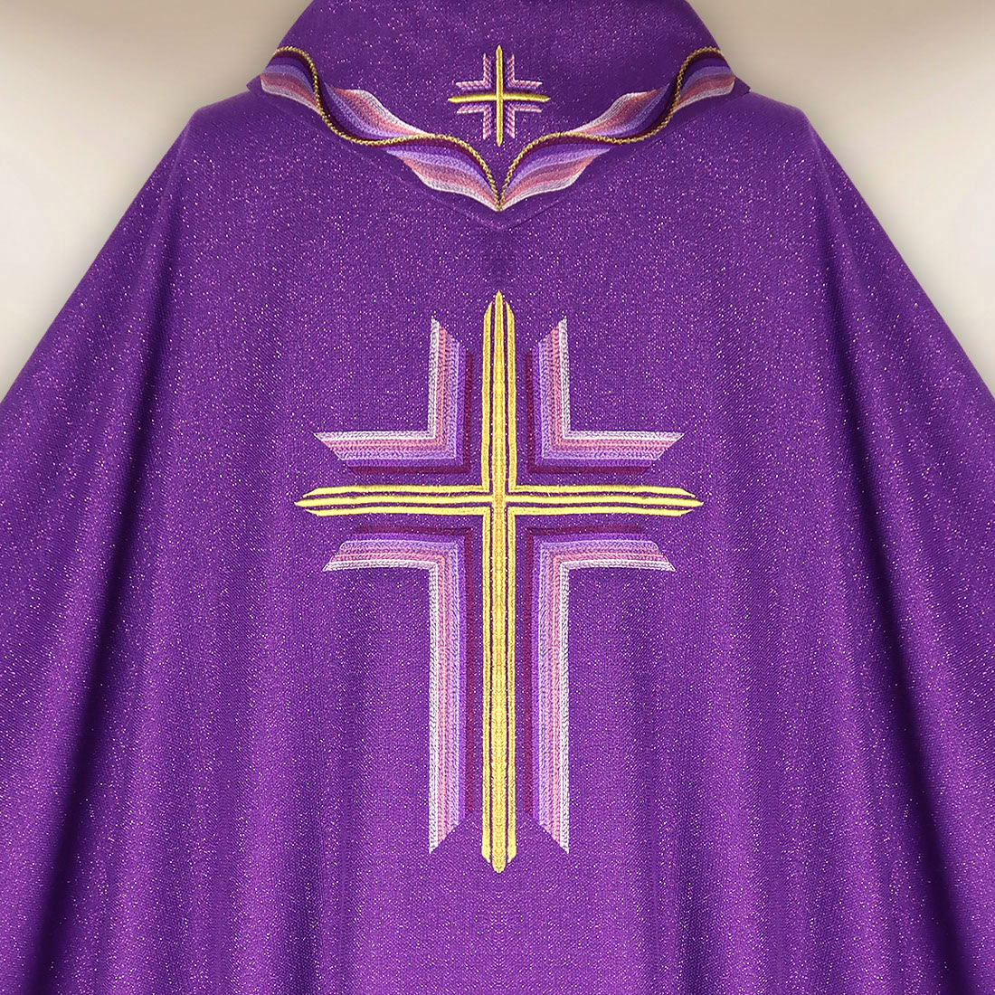 Centralnym punktem ornatu jest starannie haftowany krzyż, wykonany precyzyjną techniką, dzięki której motyw pozostaje elegancki i czytelny. Jego klasyczna forma została uzupełniona o dekoracyjne obrzeża w stylu ombre, dodające szacie lekkości i głębi wizualnej, a jednocześnie zachowujące powagę właściwą liturgii fioletowej. Złote akcenty haftu wprowadzają delikatny blask, który pięknie harmonizuje z odcieniem materiału.
