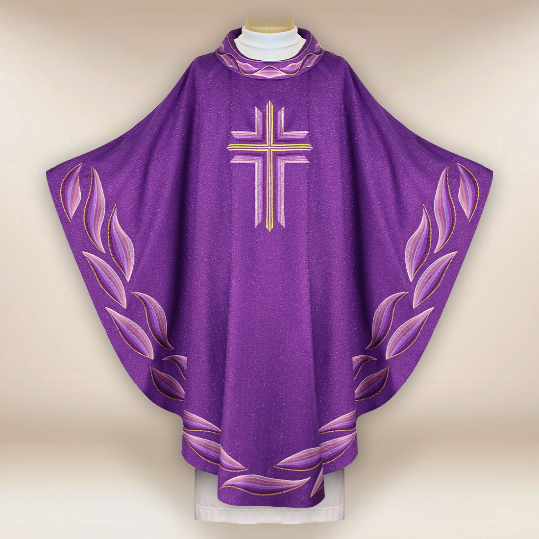 Ornat haftowany fioletowy ombre to szata stworzona z myślą o liturgiach okresów pokuty, oczekiwania i wewnętrznego skupienia. Fiolet od wieków symbolizuje refleksję, pokorę i duchową odnowę, dlatego szata w tej tonacji doskonale podkreśla modlitewny charakter celebracji. Model „Ombre Colorate” łączy klasyczną symbolikę z subtelnym, nowoczesnym akcentem, tworząc wyjątkową kompozycję o wysokiej estetyce liturgicznej.